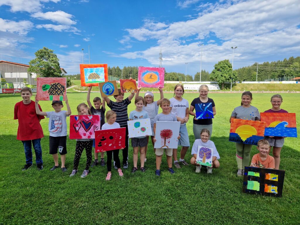 Mit Kreativität und Begeisterung waren im Rahmen des Ferienprogramms 2025, 14 Kinder mit Eifer dabei, verschiedene Mahltechniken, wie die Tupf-, Schwamm-, Spachtel-, Lasurtechnik und das Punkten mit Acrylfarben auf Malkarton und Leinwand zu erlernen und selbstständig mit viel Fantasie zu kombinieren.