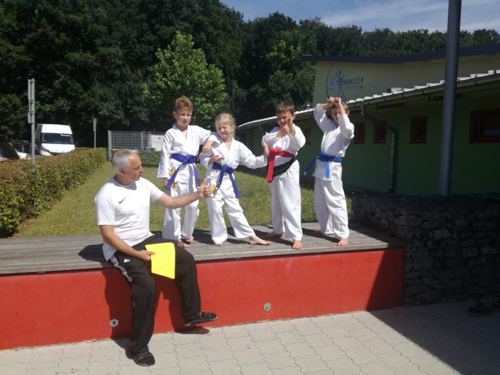 Am 27. Oktober 2022 organisierte unser Karatetrainer Richard Schalch für die Karatekids und deren Familien eine kostenlose Burgführung auf der Burg Stein.Mit Spannung lauschten die zahlreich erschienenen Familien den aufregenden Erzählungen des Burgführers von Anfang bis zum Ende.Die geheimnisvolle Sage um den angeblichen „Folterbrunnen“ führte zu offenen Mündern bei den Kindern. Oder diente er doch nur zur Wasserversorgung? Das bleibt wohl für immer ein Geheimnis…Wir konnten uns am Ende der Führung noch selbst ein Bild davon machen wie anstrengend der steile Aufstieg durch den niedrigen Geheimgang für die Ritter mit Rüstung gewesen sein muss.Nach dieser Anstrengung erhielt jeder Teilnehmer ein Erfrischungsgetränk der Brauerei Stein.Gemeinsam rundeten wir den Ausflug mit einem Abendessen im Steiner Bräustüberl ab.