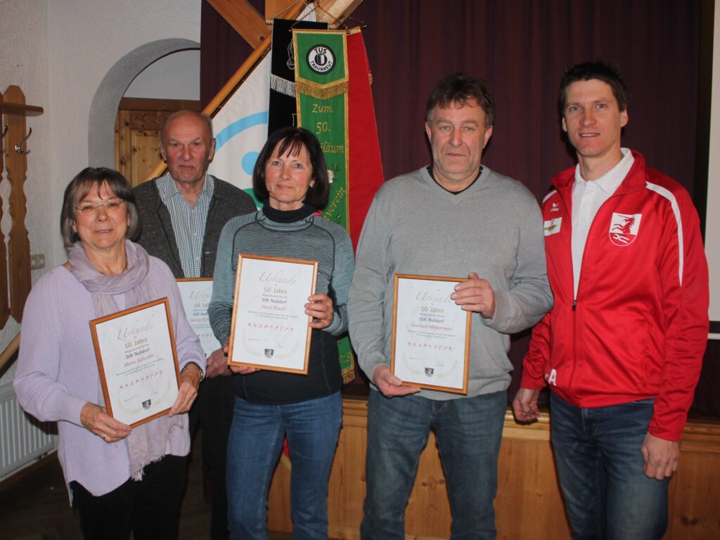 Für 50 Jahre Mitgliedschaft beim Sportverein DJK Nußdorf wurden geehrt: (von links): Maria und Georg Schuster, Heidi Rauth und Gerhard Mittermaier. Vereinschef Franz Aigner (rechts) überreichte eine Ehrenurkunde.