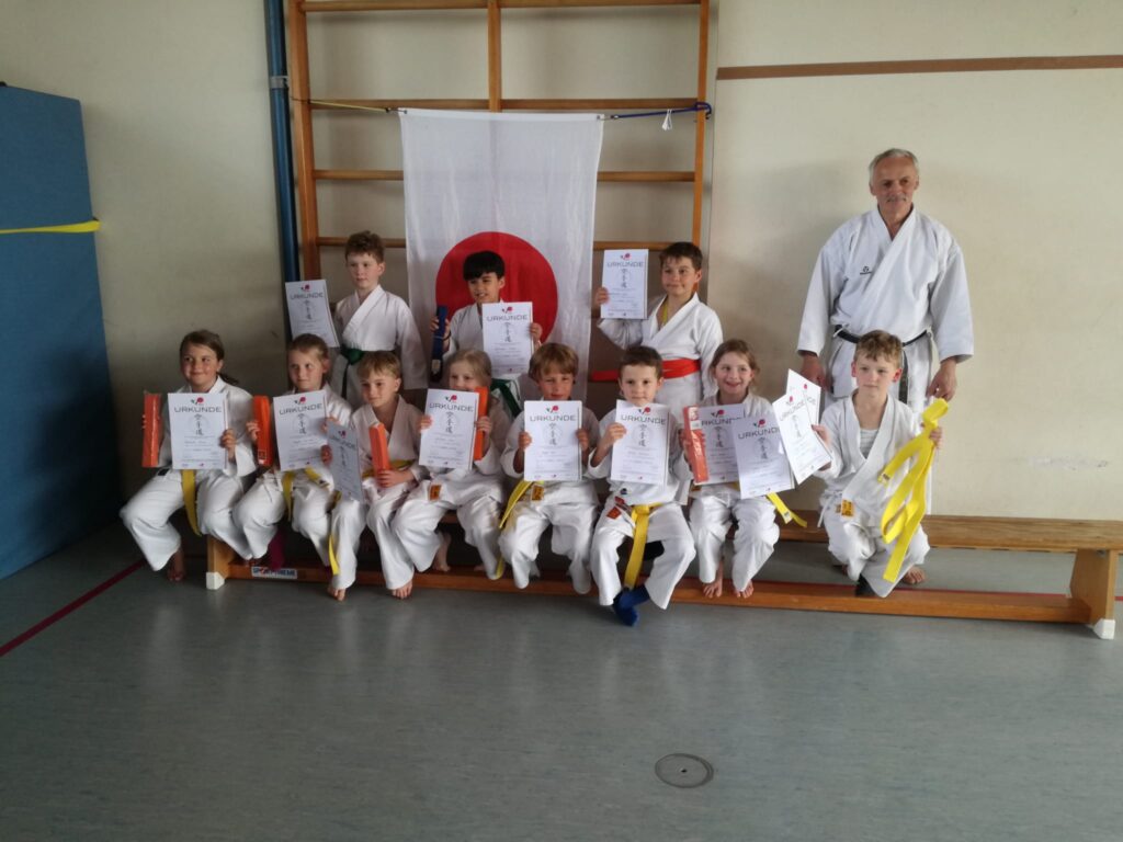 Am 27.April.2023 war es endlich so weit, es stand wieder eine Kyu-Gurtprüfung in unserer Turnhalle statt. Nach monatelangem intensiven Training konnten wir 10 Kindern aus unserer Abteilung zur erfolgreichen bestandenen Prüfung gratulieren. Los ging es um 15 Uhr und alle Kinder kamen aufgeregt und pünktlich mit Ihren Eltern zur Prüfung. Für einige war es die erste Gürtelprüfung, für andere die Zweite bzw. Dritte. Die Prüfung wurde von unserem Trainer Richard Schalch (6.Dan.) geleitet. Und dauerte 2 Stunden.Am Ende der Prüfung konnten sich dann alle teilnehmenden Kinder über ihre nächste Gürtelfarbe und Urkunde freuen. Insgesamt gab es 3 x Gelbgurt 6 x Orangegurt und 1x Grüngurt.Wir Gratulieren noch einmal allen Teilnehmern und wünschen weiterhin viel Erfolg auf ihrem Karate Weg.