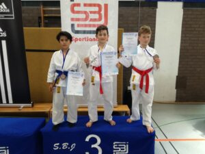 Hierbei konnten die erst kürzlich zusammen Trainierenden Kinder am Ende der Disziplin Team Kata male U12 einen sehr guten 3. Platz Bronzemedaille für sich und Deutschland erarbeiten.